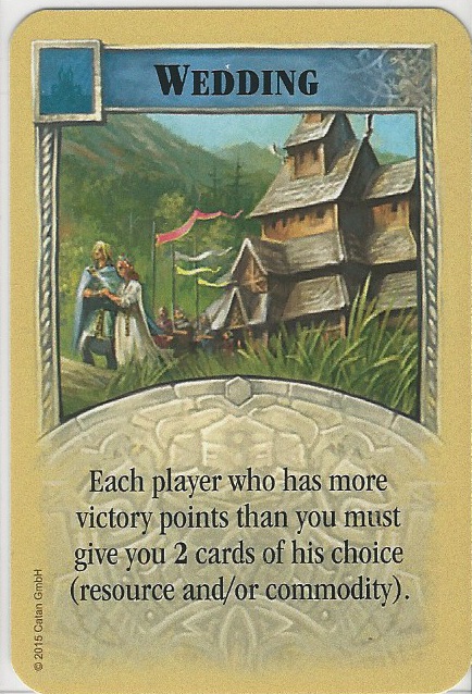 Despite having exactly the same artwork as the "Chapel" development card, this Blue Progress card from the Cities & Knights game expansion is called "Wedding." As shown above, this coveted card is powerful. You can declare a wedding by playing this card at any time during your turn (how cool is that?). Luckily for you, all of your opponents are invited, and those with more victory points than you must bring a sizable gift! This is definitely one wedding you don't want to miss!