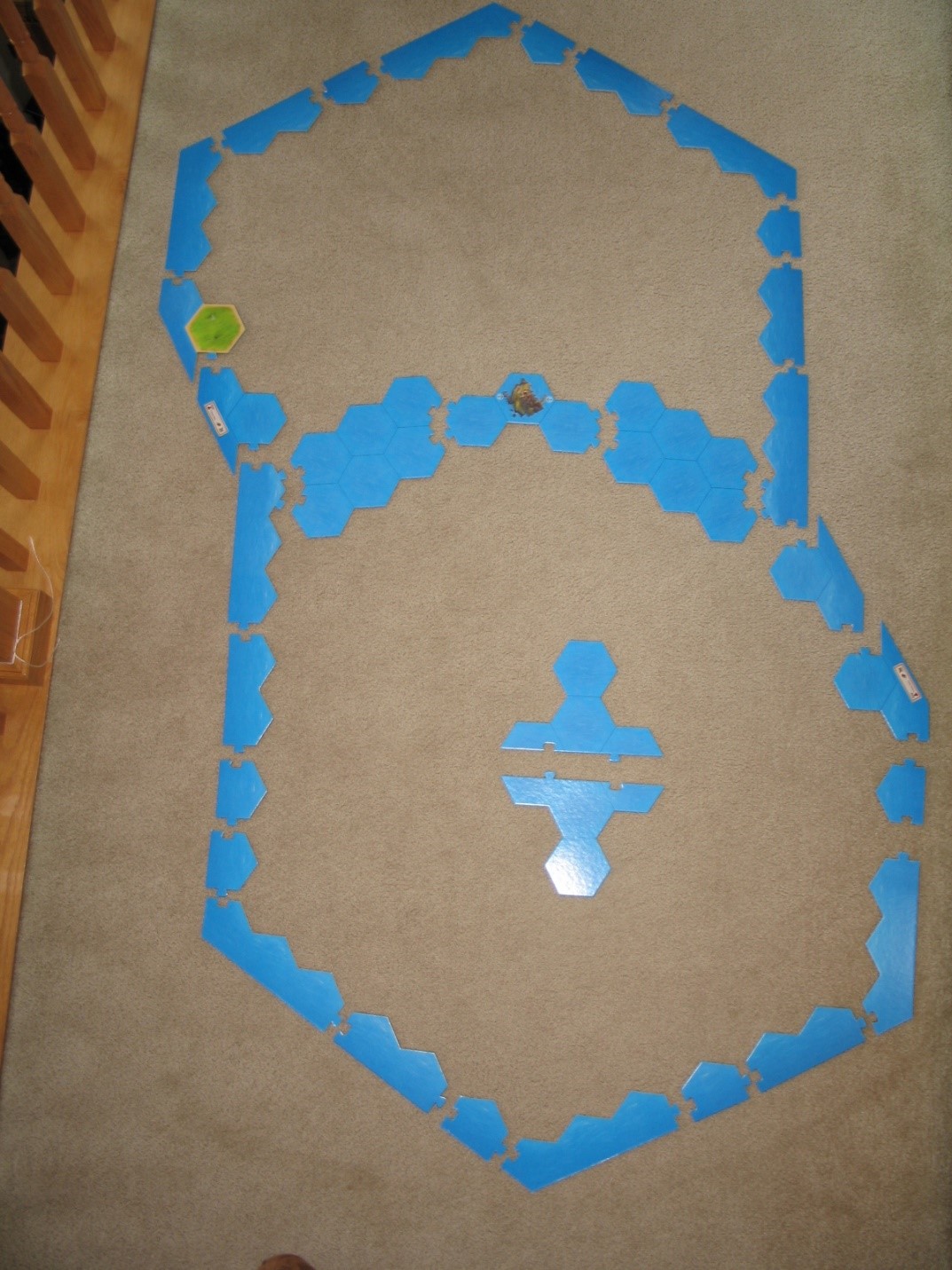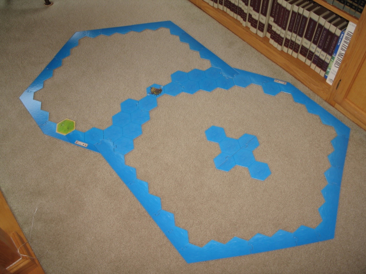 As you can see, we had to build this on the floor, because it simply wouldn't fit on any standard table we could find. We recommend that you simply build the game board to fit the space you have, whether or not you choose to use a frame for your game of Catan. Remember, the important thing is what you put IN the frame (the hexes), not the frame itself.